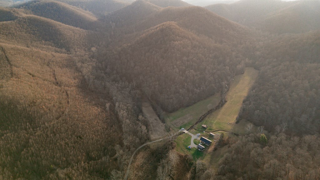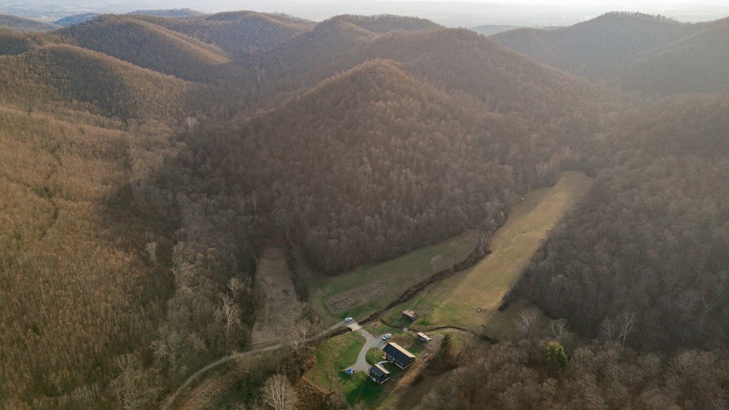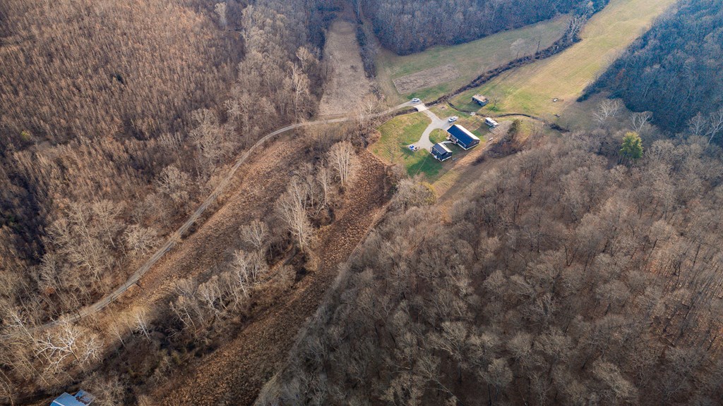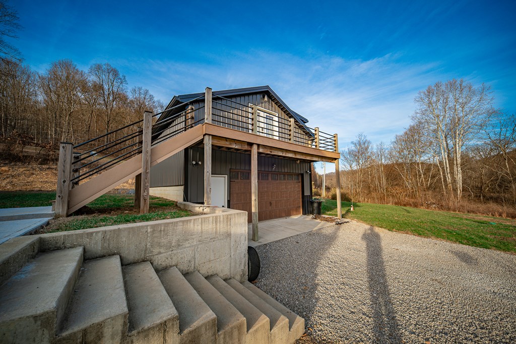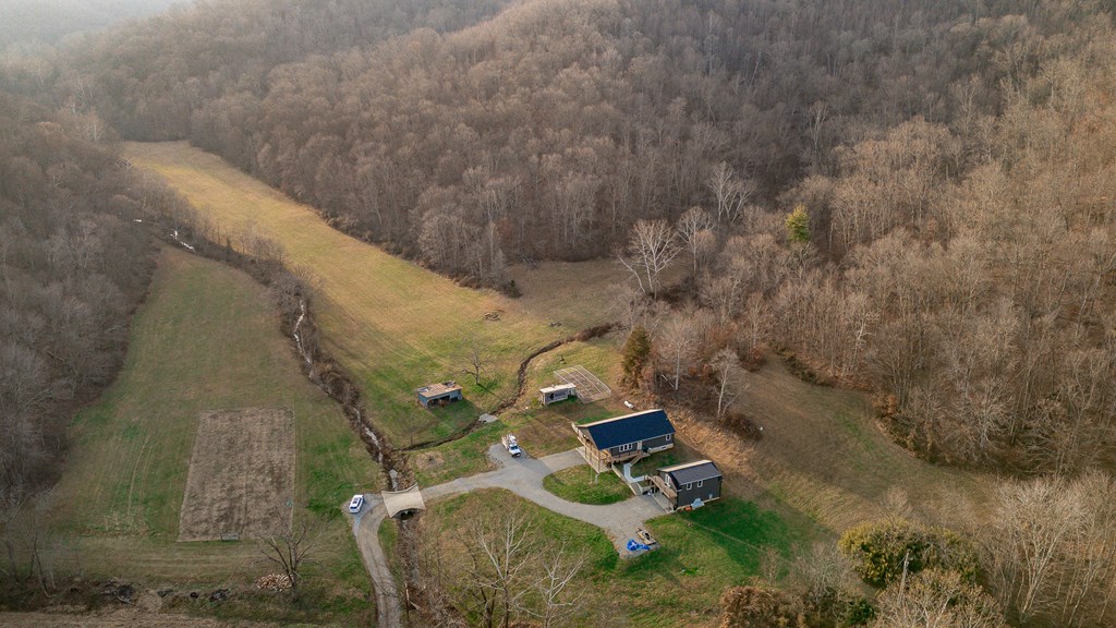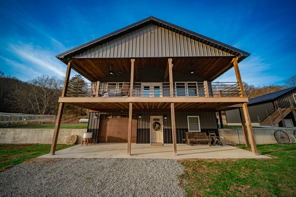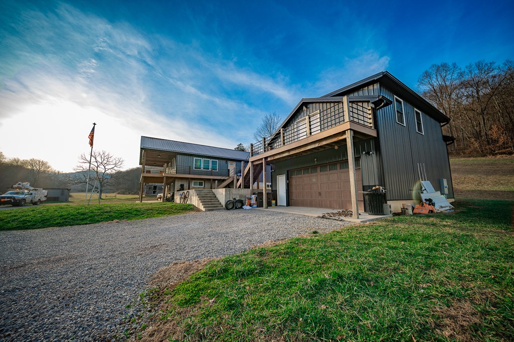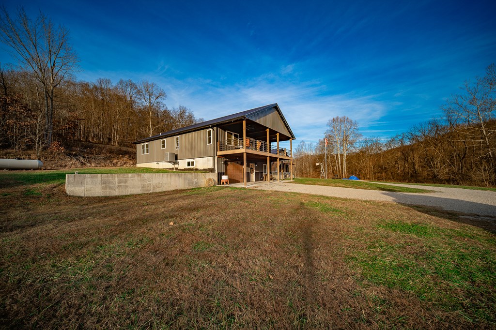 Escape to your own private retreat on 125 breathtaking wooded acres of rolling hills and panoramic views. This striking 2021-built home features durable metal siding and a metal roof, blending modern construction with rustic appeal. A wraparound porch invites you to slow down and take in the peaceful surroundings from every angle. The thoughtfully designed main level offers two bedrooms, a full bathroom, and a spacious living area. Upstairs, an expansive open-concept living, kitchen, and dining space is highlighted by vaulted ceilings, exposed wood beams, and a stunning stone fireplace. The primary bedroom includes a walk-in closet and ensuite bath, creating a true sanctuary. A convenient combined laundry and half bath adds functionality. The detached garage is complete with loft apartment featuring open-concept layout, perfect for guests, hunters, or multi-family living. And you won’t want to miss the old log cabin in the woods! This one of a kind property is sure to impress you!