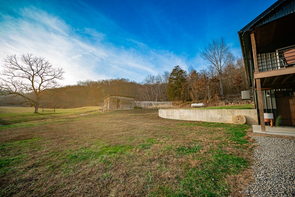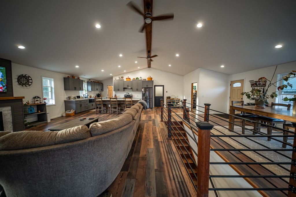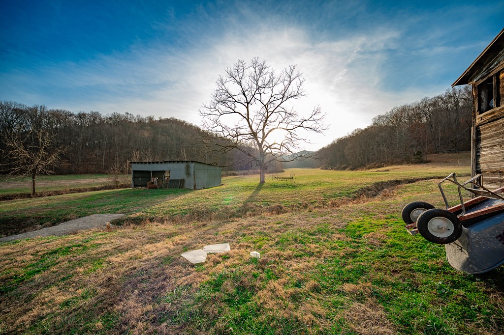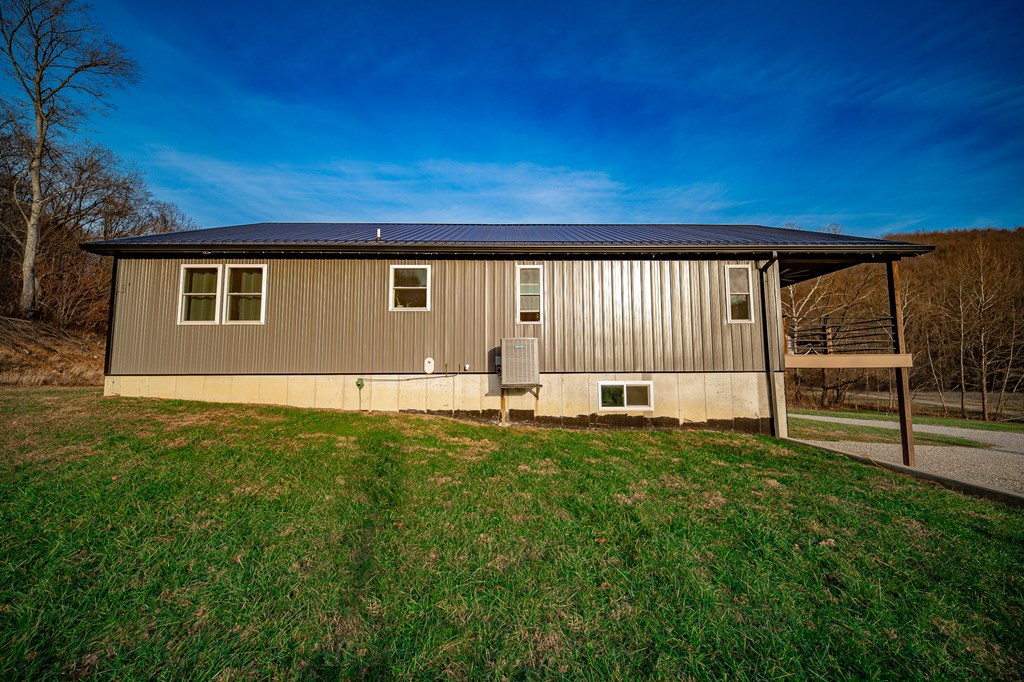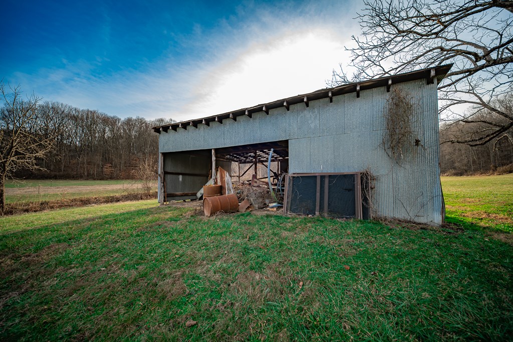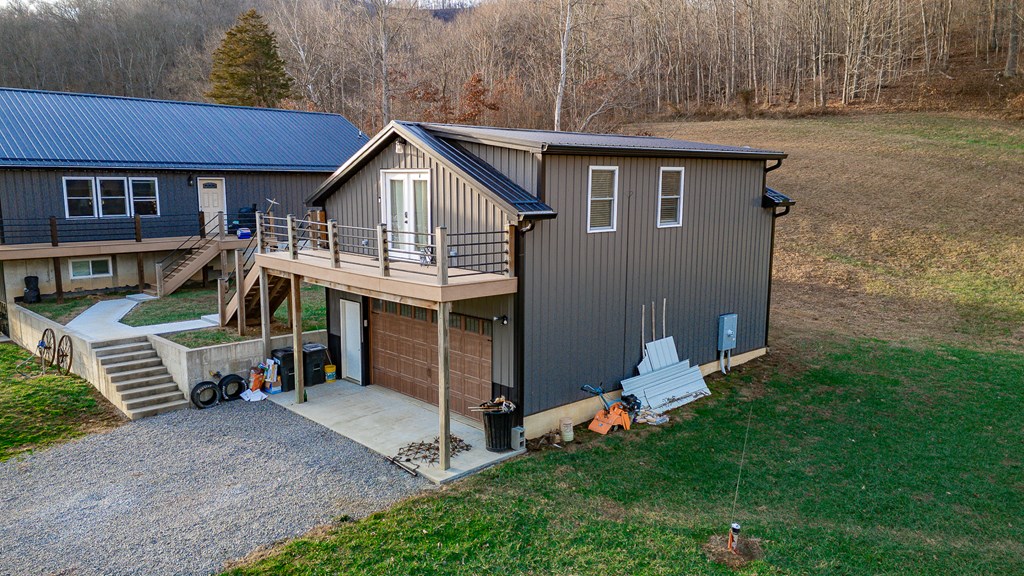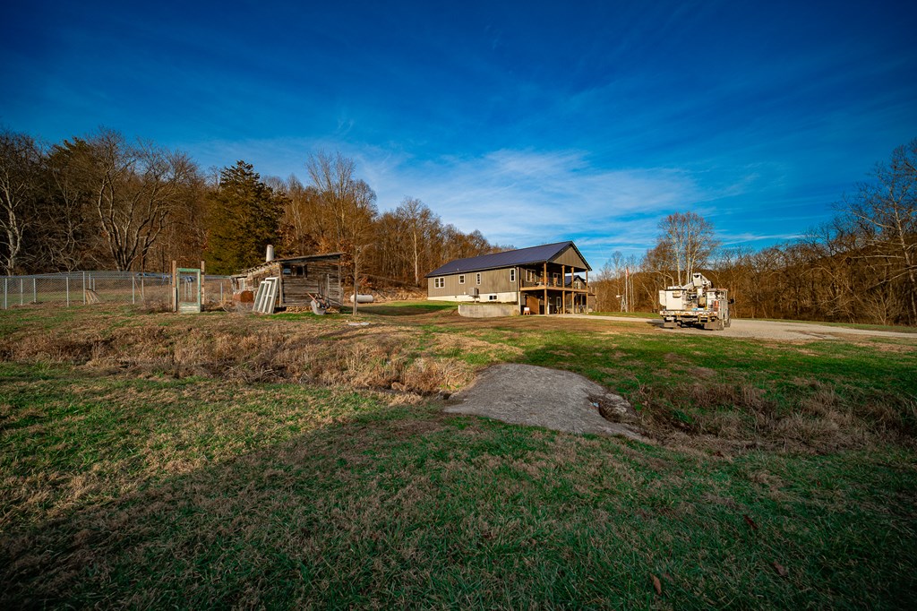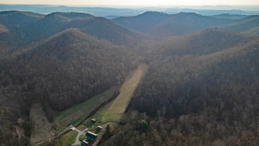Escape to your own private retreat on 125 breathtaking wooded acres of rolling hills and panoramic views. This striking 2021-built home features durable metal siding and a metal roof, blending modern construction with rustic appeal. A wraparound porch invites you to slow down and take in the peaceful surroundings from every angle. The thoughtfully designed main level offers two bedrooms, a full bathroom, and a spacious living area. Upstairs, an expansive open-concept living, kitchen, and dining space is highlighted by vaulted ceilings, exposed wood beams, and a stunning stone fireplace. The primary bedroom includes a walk-in closet and ensuite bath, creating a true sanctuary. A convenient combined laundry and half bath adds functionality. The detached garage is complete with loft apartment featuring open-concept layout, perfect for guests, hunters, or multi-family living. And you won’t want to miss the old log cabin in the woods! This one of a kind property is sure to impress you!