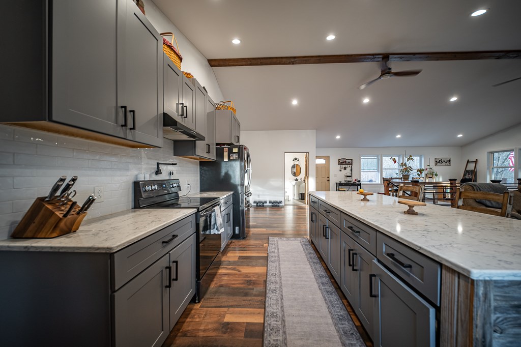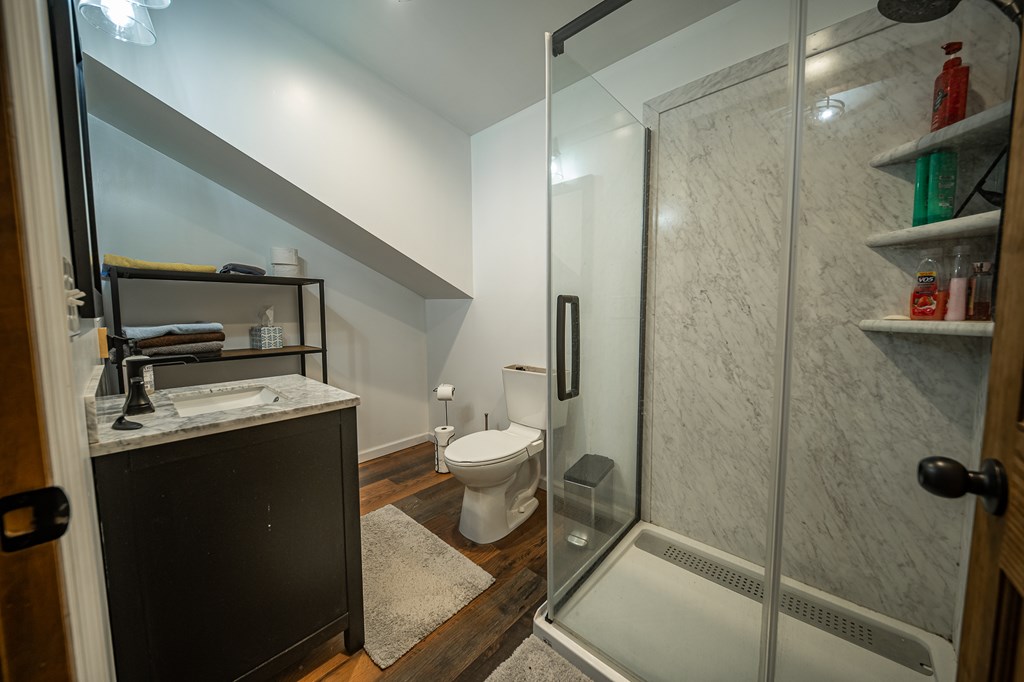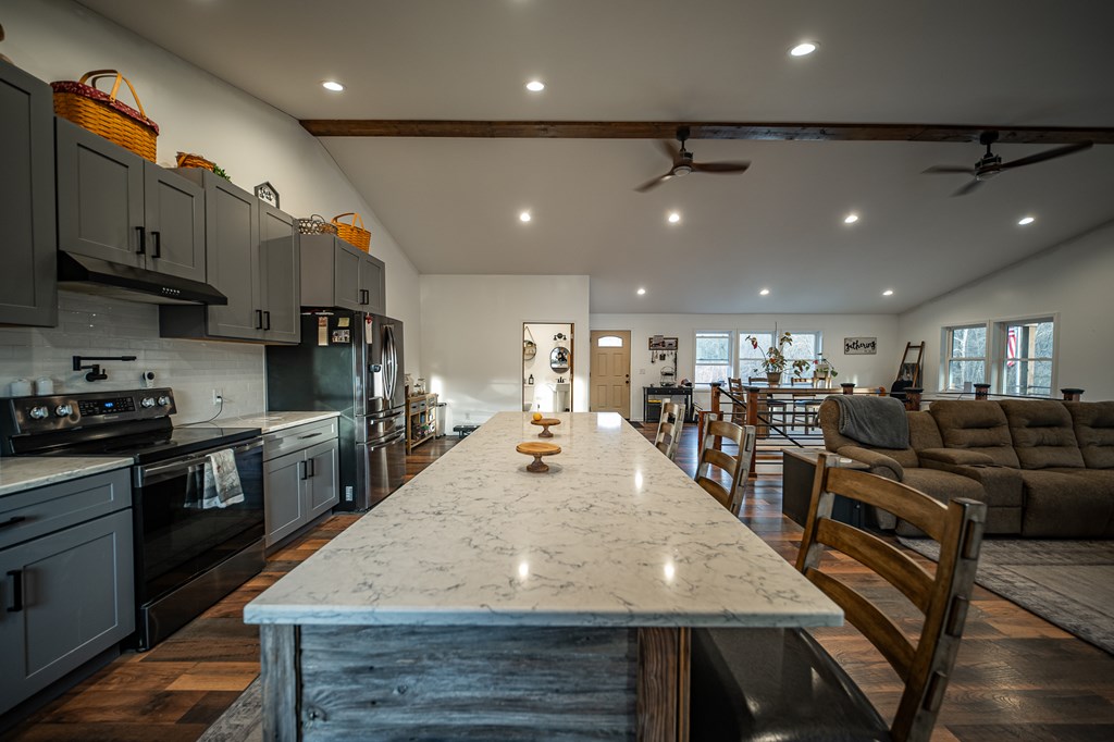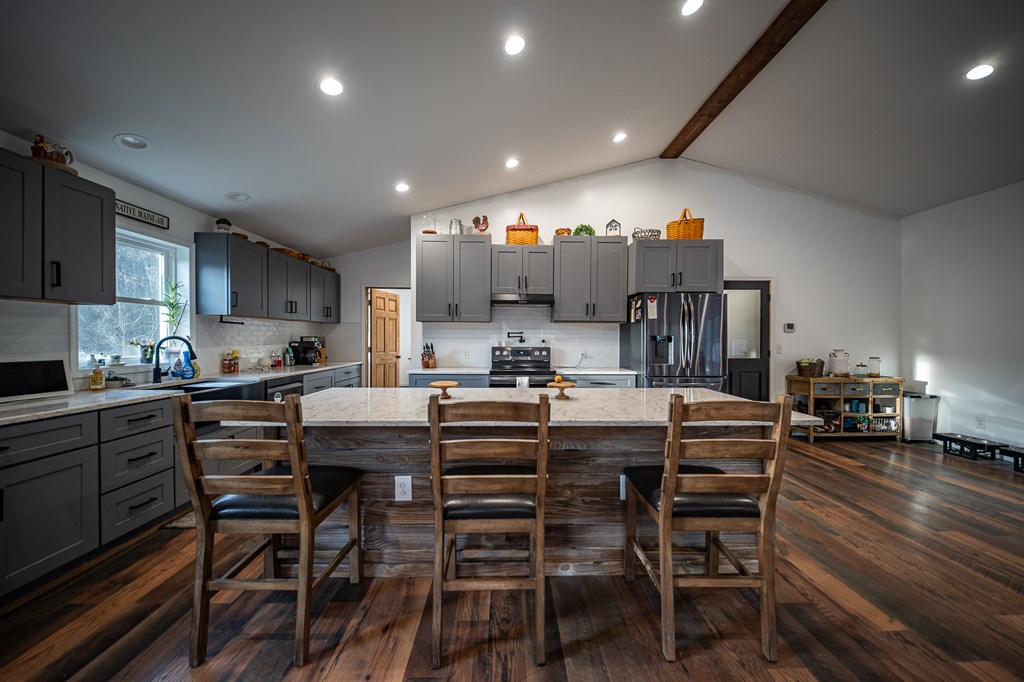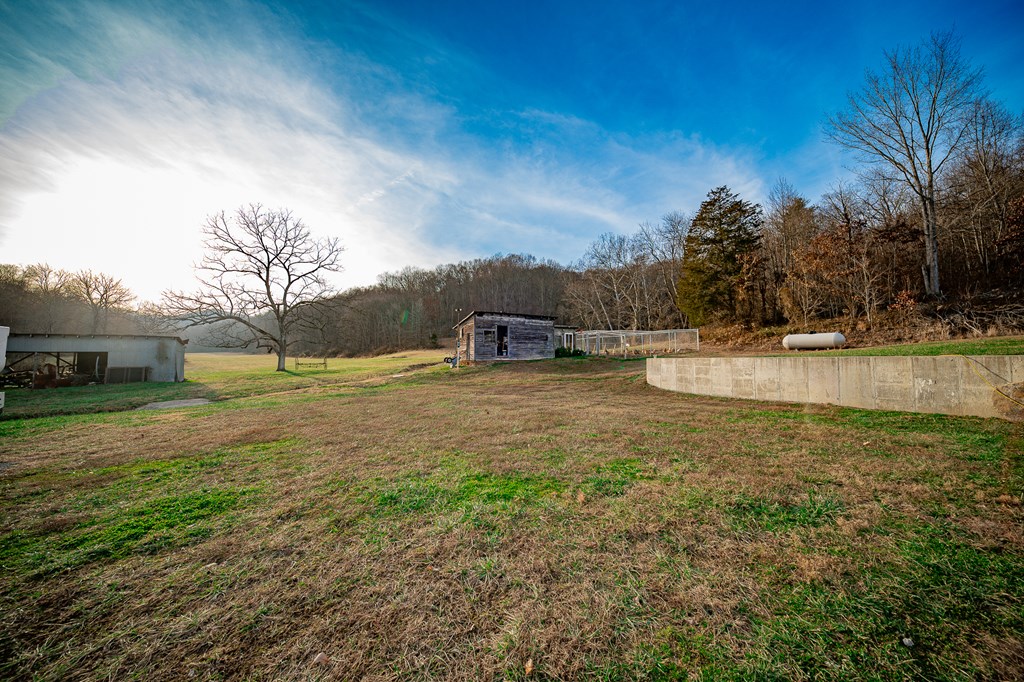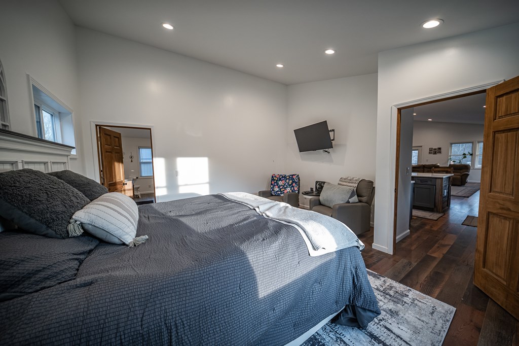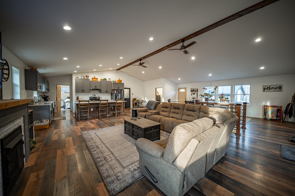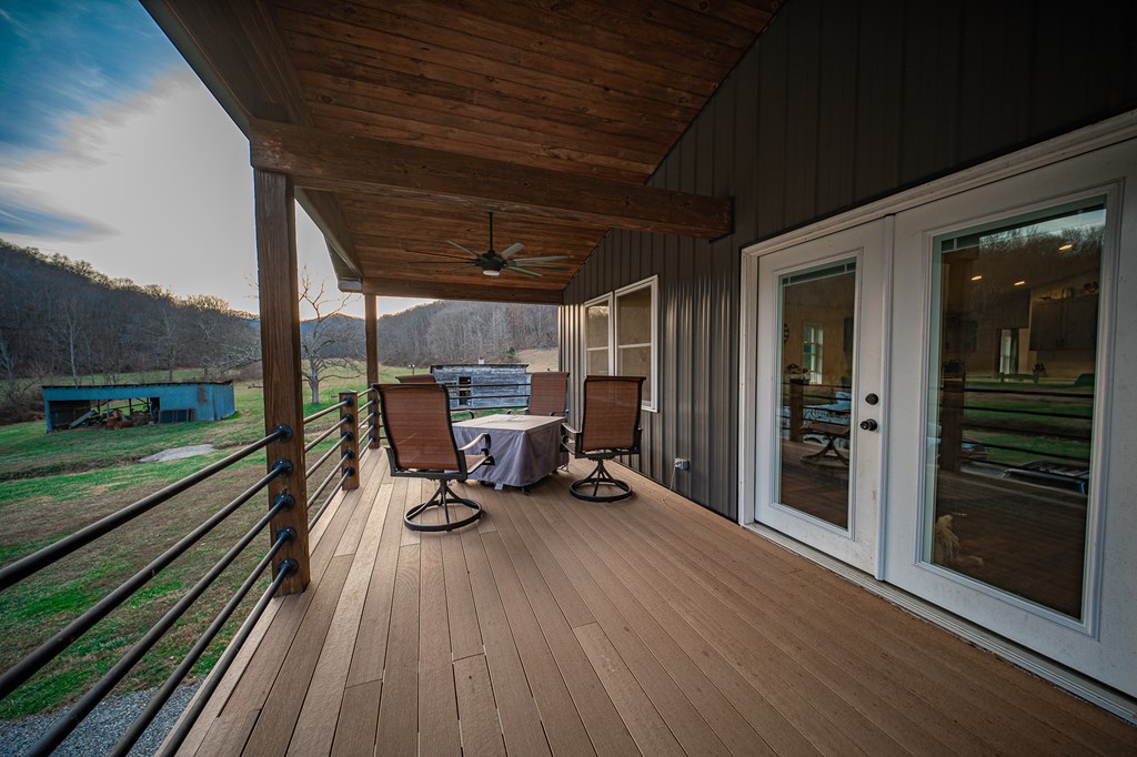 Escape to your own private retreat on 125 breathtaking wooded acres of rolling hills and panoramic views. This striking 2021-built home features durable metal siding and a metal roof, blending modern construction with rustic appeal. A wraparound porch invites you to slow down and take in the peaceful surroundings from every angle. The thoughtfully designed main level offers two bedrooms, a full bathroom, and a spacious living area. Upstairs, an expansive open-concept living, kitchen, and dining space is highlighted by vaulted ceilings, exposed wood beams, and a stunning stone fireplace. The primary bedroom includes a walk-in closet and ensuite bath, creating a true sanctuary. A convenient combined laundry and half bath adds functionality. The detached garage is complete with loft apartment featuring open-concept layout, perfect for guests, hunters, or multi-family living. And you won’t want to miss the old log cabin in the woods! This one of a kind property is sure to impress you!
