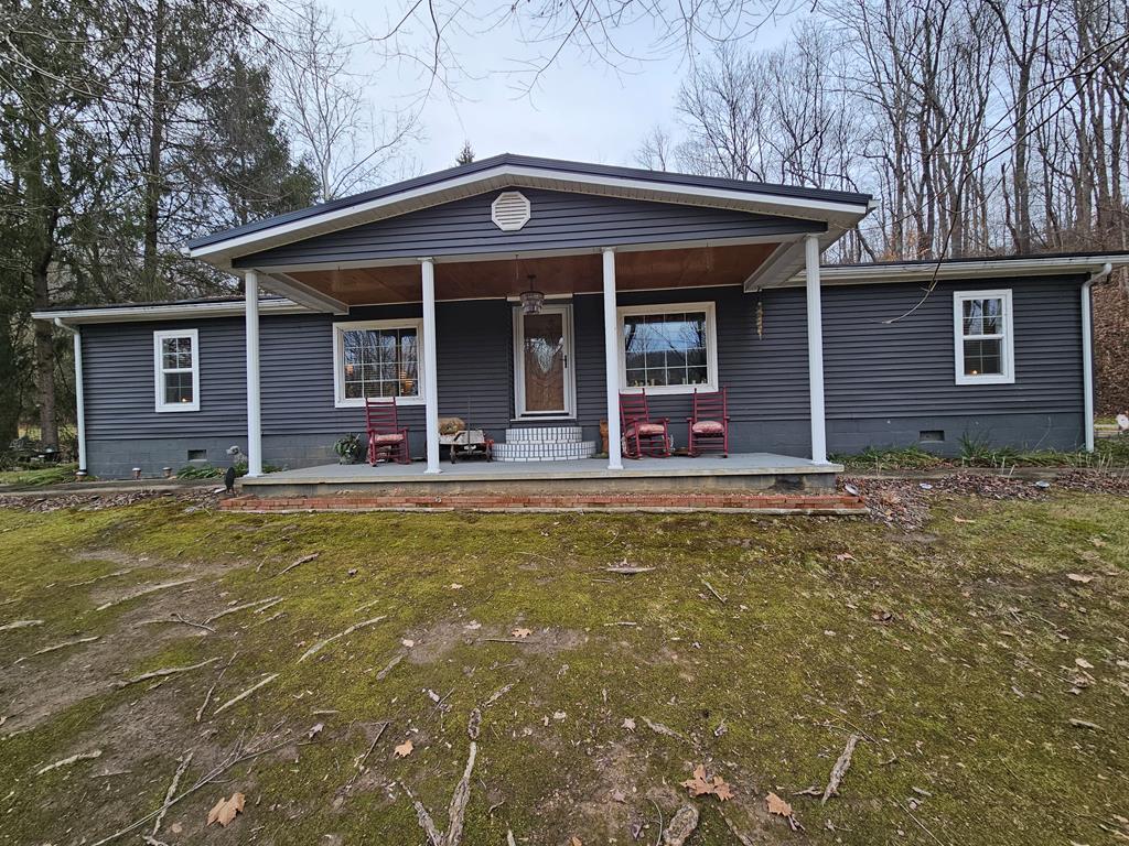 This charming three-bedroom, two-bathroom home nestled in the tranquil countryside boasts a well-maintained exterior and interior. As you approach the house, you’re greeted by a partially black-top driveway, offering both functionality and rustic charm. The covered front porch welcomes you into the home, providing a cozy spot to relax. Stepping inside, the spacious living and family room combination area immediately captures your attention. Its generous size accommodates various seating arrangements, perfect for gatherings or quiet evenings by the fireplace. Adjacent to the living area, a separate dining room awaits, providing an ideal setting for family meals or entertaining guests. The kitchen is thoughtfully designed, ample storage, and countertop space. The primary bedroom includes an ensuite bathroom for added convenience and privacy. Outdoor living is complemented by the presence of an above-ground pool, offering a refreshing retreat. The covered back porch provides ample shade.
