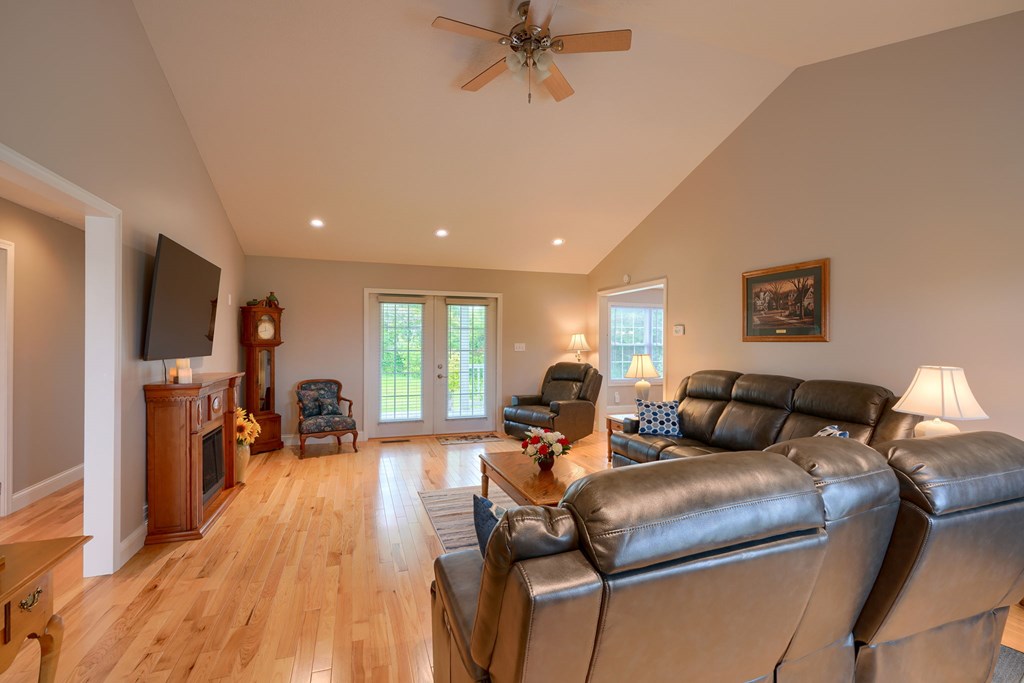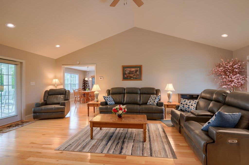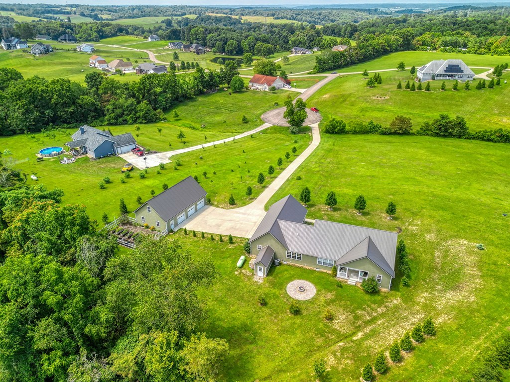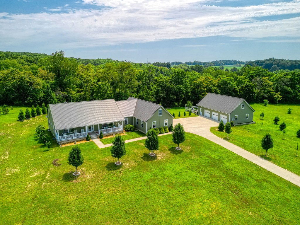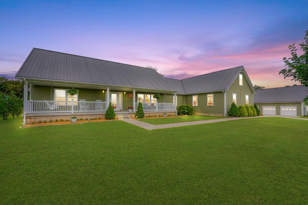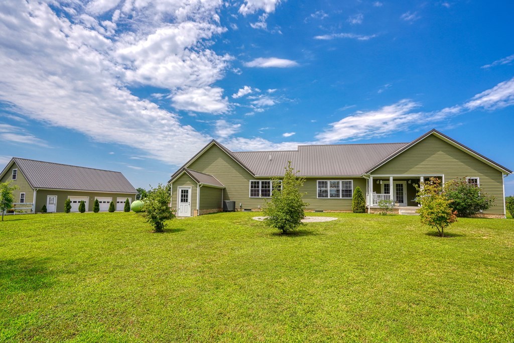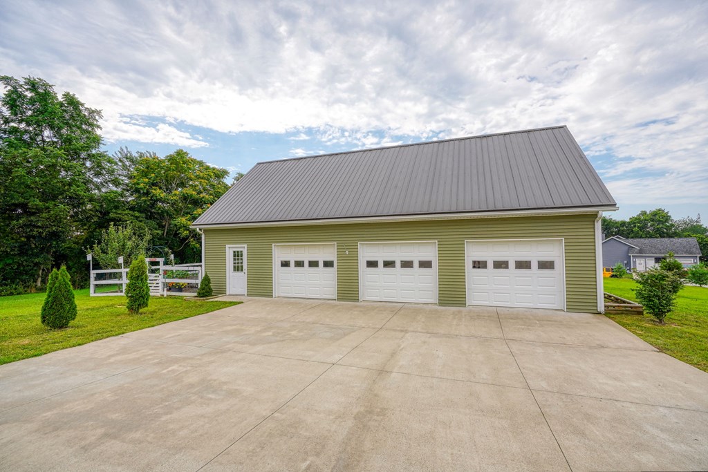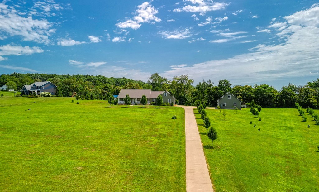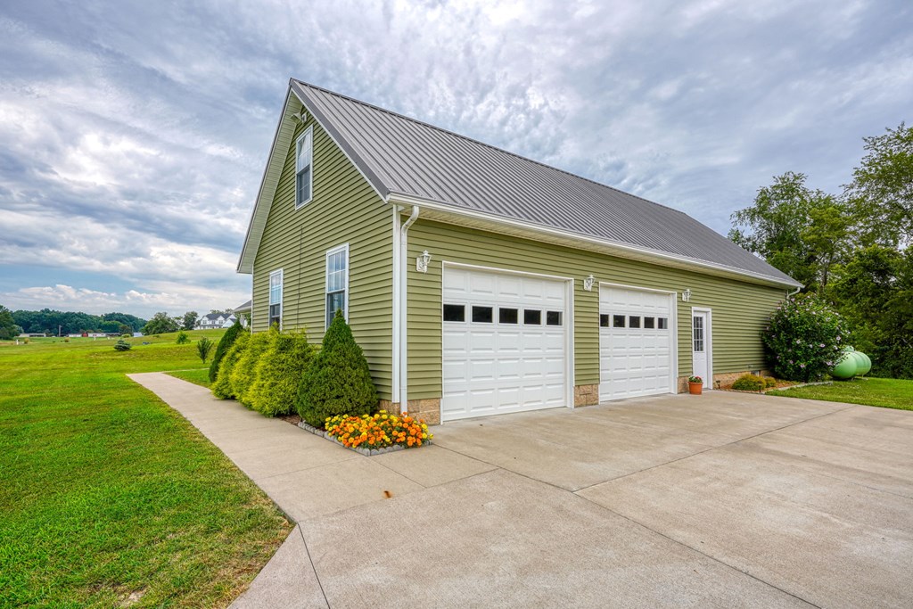 Welcome to 85 Liberty Lane in Mountain Meadow Estates. This spectacular one-level home, completed in 2016, features 2 separate living spaces perfect for extended family. The main home, with hickory flooring, offers 3 bedrooms, 2.5 baths, a spacious living room, a dining room open to an Amish custom-built kitchen with a large eat-in island and pantry, all appliances included. The primary bathroom boasts a double vanity, tub, and shower. A bonus office above the garage adds extra space. The attached 2-car garage leads to a 9-foot finished basement with another top-of-the-line kitchen, bedroom, dining room, laundry, office, and bathroom with soaking tub and shower, plus a private exit. The detached 28×48 3-car garage with attic storage accommodates extra vehicles and outdoor hobbies. Enjoy sunset views from the large covered front porch and wooded views from the back porch, extending to the fire pit and fenced-in raised gardens. Surrounded by 3.581 acres of mature landscaping, a must-see!
